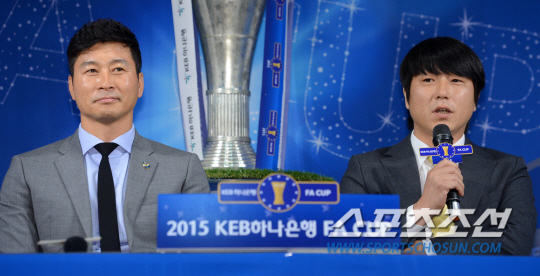 2015 KEB 하나은행 FA컵 준결승 미디어데이가 24일 서울 신문로 축구회관에서 열렸다. 준결승에서 만나게 된 인천 김도훈 감독과 전남 노상래 감독이 질문에 답하고 있다. 허상욱 기자 wook@sportschosun.com