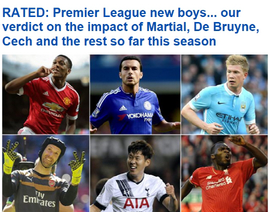 '프리미어리그 뉴보이(new boy)들의 성적표'라는 제하에 '리그 톱6 클럽 가운데 앤서니 마샬, 케빈 데브루인, 손흥민이 인상적이었다'는 부제를 달았다. 맨유, 맨시티, 첼시, 아스널, 리버풀, 토트넘 이적생들의 초반 활약상을 체크했다.