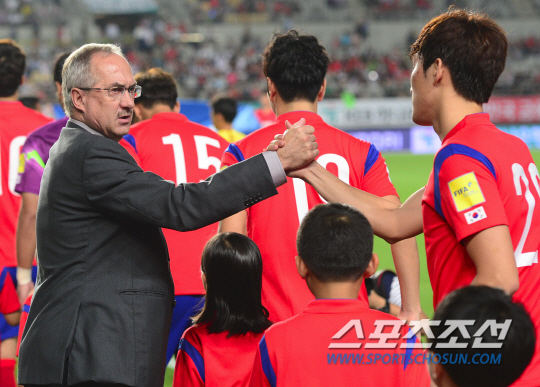 2018 러시아월드컵 아시아 지역 2차예선 2차전 한국 대 라오스의 경기가 3일 오후 화성종합경기타운에서 열렸다. 선수단 입장 때 슈틸리케 감독이 선수들과 악수를 하며 맞이하고 있다. 화성=정재근 기자 cjg@sportschosun.com/2015.09.03/