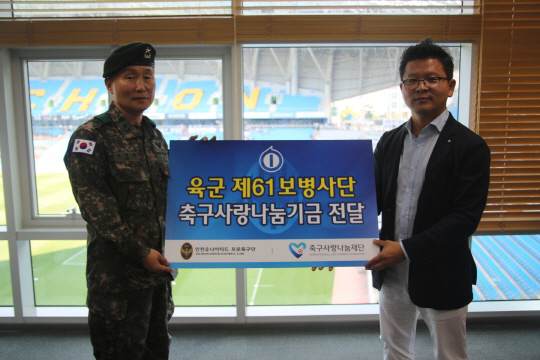 시민구단 인천 유나이티드가 인천 연고 군부대인 육군 제61보병사단에 부대 발전 기금을 기부했다.