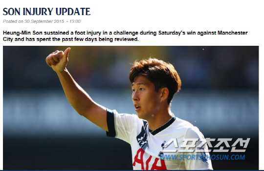 손흥민(토트넘)도 부상에 신음하고 있다. 토트넘은 9월30일 구단 홈페이지와 SNS를 통해 '손흥민이 맨시티전에서 발 부상을 했다. 며칠간 몸 상태를 지켜봐야 한다'고 전했다. 손흥민은 26일 영국 런던 화이트하트레인에서 벌어진 맨시티와의 2015~2016시즌 잉글랜드 프리미어리그(EPL) 7라운드 홈 경기에 선발 출전, 77분을 소화했다. 공격포인트는 기록하지 못했지만, 활발한 움직임으로 팀의 4대1 승리를 견인했다. 입단 후 5경기에서 3골을 넣으며 연착륙한 손흥민은 보름만에 부상에 발목이 잡혔다. 다음달 2일 AS모나코와의 유로파리그 2차전 출전이 불투명한 상황이다. 토트넘은 '의료진은 손흥민의 부상 경과를 지켜본 뒤 훈련 복귀 시점을 결정할 것'이라고 밝혔다.