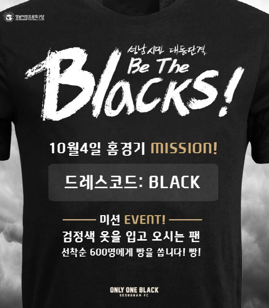 이날 경기는 '제 42주년 성남시민의 날(10월8일)'을 맞아 시민들과 함께하는 다양한 이벤트가 진행된다. 먼저 드레스 코드를 성남FC의 홈 유니폼 컬러인 '블랙'으로 정해 성남시민들의 힘을 한데 모을 예정이다. 블랙 상의를 입고 입장하는 관중들 중 선착순 600명에게 맛있는 간식거리를 증정한다.
