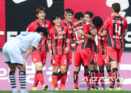 2015 K리그 클래식 FC서울과 전남드래곤즈의 경기가 정규라운드 최종전이 4일 상암동 서울월드컵경기장에서 열렸다. 후반 서울 윤주태가 역전골을 넣은 후 몰리나 등 동료들과 기뻐하고 있다. 서울은 14승 9무 9패 승점 51점으로 5위를 달리며 이미 상위 스플릿 진출을 확정지었다. 전남은 10승 12무 10패 승점 42점으로 8위. 6위 인천과는 승점 3점 차, 7위 제주와는 1점 차다. 골득실에서도 인천에 5점 차로 뒤져있다. 서울월드컵경기장=정재근 기자 cjg@sportschosun.com/2015.10.4/ |