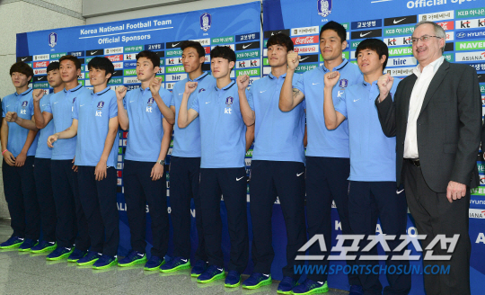 슈틸리케 감독이 이끄는 축구대표팀이 러시아월드컵 아시아지역예선 쿠웨이트와의 원정경기를 치르기 위해 5일 인천공항을 통해 출국했다. 슈틸리케 감독과 선수들이 출국 전 화이팅을 외치고 있다. 대표팀은 오는 8일 쿠웨이트시티 국립경기장에서 2018 러시아월드컵 아시아지역 2차예선 G조 4차전 쿠웨이트와의 원정경기를 치른다. 인천공항=정재근 기자 cjg@sportschosun.com