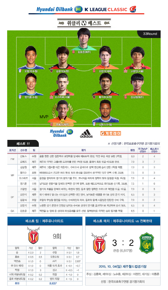 33라운드 베스트 11도 공개됐다. 최고 공격수로는 로페즈와 함께 광주전에서 해트트릭을 완성한 산토스(수원)이 이름을 올렸다. 베스트 미드필더에는 김상원(제주) 황지수(포항), 오스마르(서울) 염기훈(수원), 수비수에는 고광민(서울) 오반석(제주) 김광석(포항) 오범석(수원)이 선정됐다. 제주의 김호준은 최고 골키퍼로 뽑혔다. 31라운드 베스트팀은 제주, 매치는 제주-전북(3대2 제주 승)이었다.