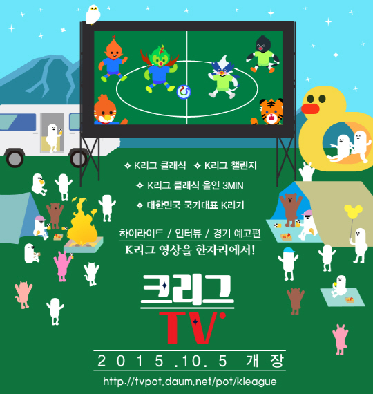 프로축구연맹은 국내외 축구팬들에게 양질의 영상 컨텐츠를 제공하기 위해 다음tv팟과 카카오TV에 '크리그TV'를 정식 오픈해 서비스 한다고 6일 밝혔다. '크리그 TV'는 현대오일뱅크 K리그 클래식 현대오일뱅크 K리그 챌린지 K리그 클래식 올인 3MIN 국가대표 K리거 카테고리로 구성됐으며, 2015시즌 K리그 영상을 총망라해 서비스 한다.