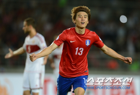 구자철이 2012년 6월 치러진 브라질월드컵 최종예선 2차전 레바논과의 경기에서 팀의 세번째 골을 성공시킨 뒤 환호하고 있다. 스포츠조선 DB