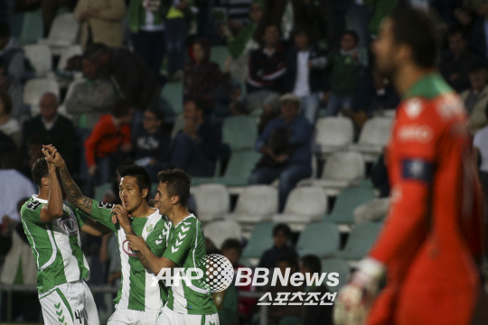| Setubal's South Korean forward Hyun-Jun Suk (2L) celebrates after scoring a goal during the Portuguese Liga football match VFC Setubal vs Sporting SC at the Bonfim stadium in Setubal on April 12, 2015. AFP PHOTO / CARLOS COSTA |