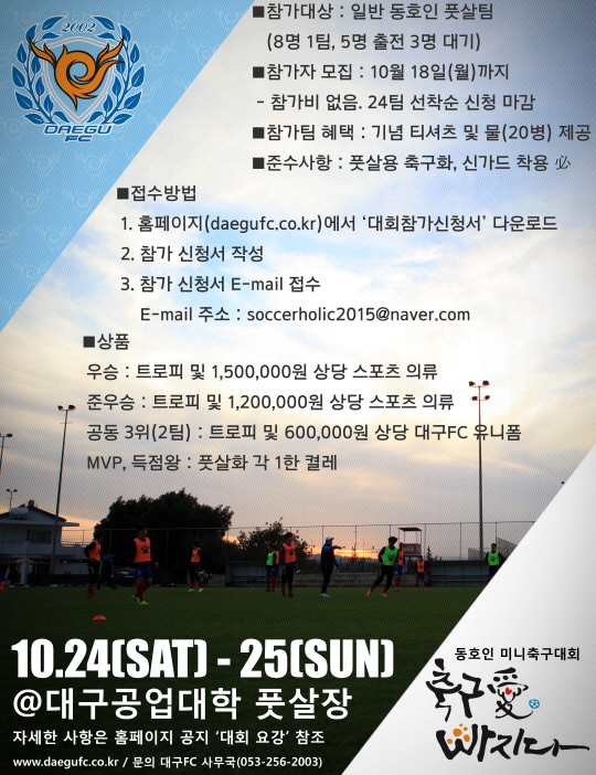 '축구愛 빠지다!' 캠페인은 2015시즌 대구FC 캐치프레이즈인 '축구사랑 2015'의 일환으로 10월 중 미니축구대회, 홈경기 등을 통해 대구 시민들의 축구사랑을 확산시키기 위해 마련됐다. 우선 24일, 25일 이틀에 걸쳐 대구공업대학 풋살장에서 동호인 미니축구대회가 열린다. 대구FC가 주최하고, 대구광역시풋살연합회가 주관하며, 국민체육진흥공단, 대구광역시생활체육회가 후원하는 이번 대회는 축구인들에게 대구FC를 알리고, 지역의 축구저변 확대 및 스포츠를 통한 건전한 교류문화 형성에 기여하기 위해 준비했다.