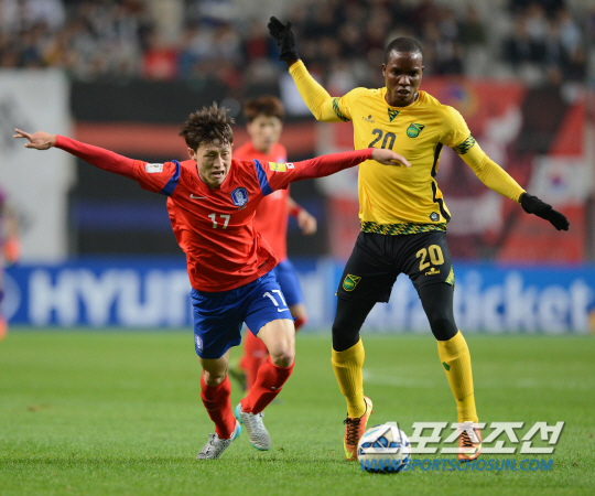 취임 1주년을 맞은 슈틸리케 감독이 이끄는 축구대표팀이 13일 서울월드컵경기장에서 자메이카와 A매치 평가전을 가졌다. 이재성과 스티븐스가 볼을 다투고 있다. 상암=허상욱 기자 wook@sportschosun.com/2015.10.13/