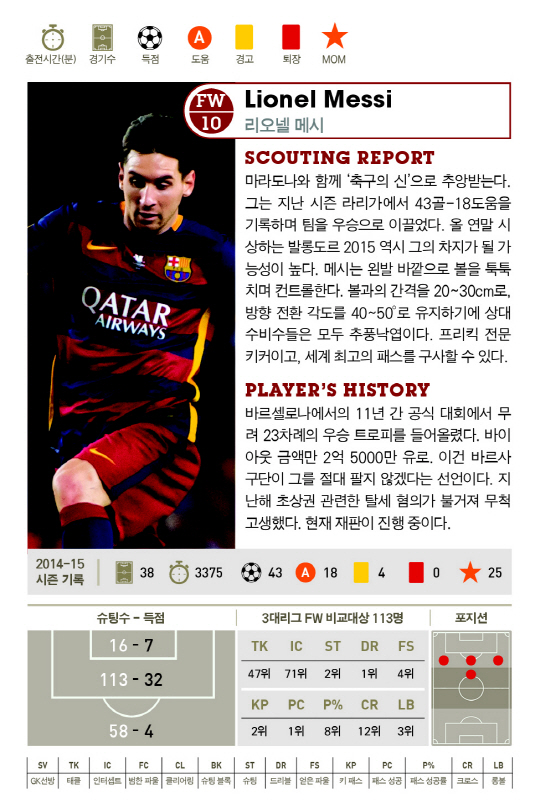 가장 눈에 띄는 건 세계 최초로 시도하는 포지션 항목별 랭킹. 골키퍼, 수비수, 미드필더, 공격수 등 4개 포지션에 대한 항목별 랭킹을 매긴 점이다. 지난 시즌 국내 리그 경기에서 800분 이상 출전한 선수들을 대상으로 선방, 태클, 인터셉트, 클리어링, 슈팅 블록, 슈팅, 드리블, 얻은 파울, 키 패스, 패스 성공 횟수, 패스 성공률, 크로스, 롱볼에 대한 경기 평균 기록을 바탕으로 모두 랭킹을 매겼다.