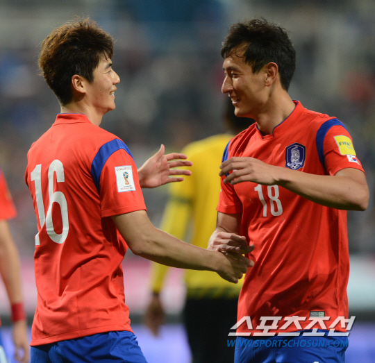 | ◇지동원(오른쪽)이 13일 서울월드컵경기장에서 열린 자메이카와의 평가전에서 후반 11분 기성용이 자신이 얻어낸 페널티킥 을 성공시키자 축하를 건네고 있다. 상암=허상욱 기자 wook@sportschosun.com |