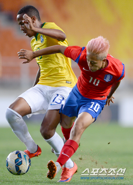 6일 수원 월드컵경기장에서 2015 수원 컨티넨탈컵 국제 청소년(U-17) 축구 대회가 열렸다. 개최국 한국과 나이지리아, 브라질, 크로아티아 4개국이 출전해 풀리그로 승부를 펼친다. 2무승부를 기록중인 대한민국이 브라질과 마지막 경기를 펼쳤다. 이승우가 브라질 수비수를 제치며 돌파를 시도하고 있다. 수원=송정헌 기자 songs@sportschosun.com/2015.09.06