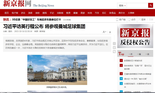 이는 영국 버킹엄궁이 15일 공개한 시 주석의 영국 방문 일정을 통해 확인됐다. 시 주석은 23일 데이비드 캐머런 영국 총리와 함께 맨체스터를 찾아 맨시티를 운영중인 시티풋볼그룹(CFG)을 방문할 것으로 알려졌다.
