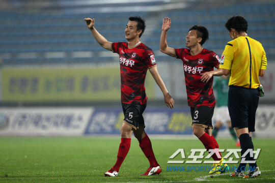 상주상무는 17일 오후 2시 상주시민구장에서 펼쳐진 K리그 챌린지 39라운드 부천FC와의 홈경기에 2대1 승리를 거뒀다. 전반 8분 박진포의 선제골이 터졌다. 세계군인체육대회에서도 골맛을 봤던 사이드백 박진포의 시즌 3호골이었다. 전반 32분 이승기의 크로스를 이어받은 공격수 조동건의 헤딩 추가골이 터지며 2-0으로 앞서나갔다. 조동건은 지난 8월2일 고양전 이후 2개월 반만에 골맛을 봤다. 후반 15분 이학민의 도움을 이어받은 부천의 호드리고가 10호골을 터뜨렸지만 거기까지였다.