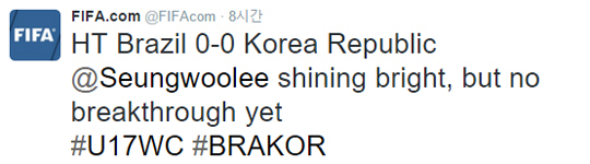 FIFA는 18일(한국 시각) 한국-브라질 전 전반전이 끝난 뒤 공식 SNS를 통해 "이승우가 빛나고 있다(Seungwoo Lee shining bright)"라고 전했다.