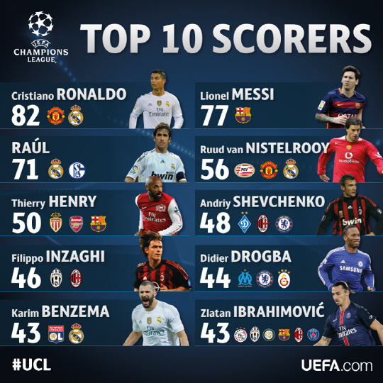 레알 마드리드의 영원한 레전드 라울 곤살레스(71골·뉴욕 코스모스)는 지난 2014-15시즌 호날두와 메시에게 추월당했다. 뤼트 판 니스텔로이(56골), 티에리 앙리(50골)이 4-5위를 기록중이다. 안드리 셰브첸코(48골), 필리포 인자기(46골), 디디에 드로그바(44골), 카림 벤제마, 즐라탄 이브라히모비치(이상 43골)가 뒤를 잇고 있다.하나같이 리그별 명문팀들을 대표하는 레전드들이다.