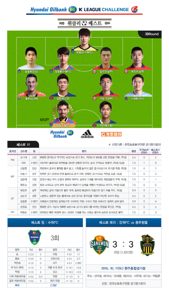 한편, 챌린지 39라운드 MVP는 수원FC의 공격수 자파가 차지했다. 자파를 비롯해 오기재 김준태(이상 고양) 신광훈 송창호(이상 안산) 이승기 박진포 김오규(이상 상주) 벨루소(강원) 김창훈 박형순(이상 수원FC)가 39라운드 베스트11에 선정됐다. 39라운드 베스트팀은 수원FC, 베스트 경기는 강원-충주전(3대3 무)이었다.