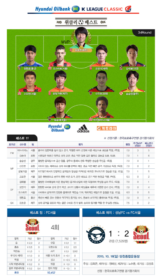 34라운드 최고의 공격수는 서울의 아드리아노와 포항의 김승대가 뽑혔다. 송승민(광주) 신진호(포항) 윤빛가람(제주) 고요한(서울)이 베스트 미드필더로 선정했다. 김태봉(대전) 오반석(제주) 오스마르(서울) 정동호(울산)이 최고의 수비수로 꼽혔다. 34라운드 MVP 김호준은 최고의 골키퍼로 이름을 올렸다. 34라운드 최고의 팀은 서울, 최고의 경기는 성남-서울전(2대1 서울 승)이 차지했다.