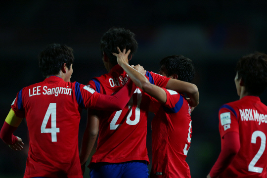 | ◇오세훈(왼쪽 두 번째)이 21일(한국시각) 칠레 라세레나의 에스타디오라포르타다에서 가진 기니와의 2015년 FIFA U-17월드컵 조별리그 B조 2차전에서 후반 추가시간 결승골을 넣은 뒤 동료들의 축하를 받고 있다. ◇사진제공=대한축구협회 |