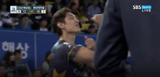 하지만 논란의 장면이 연출됐다. 25일 천안 유관순체육관에서 벌어진 현대캐피탈-KB손해보험의 2015~2016시즌 NH농협 V리그 1라운드 경기. 2세트 12-18로 뒤진 상황에서 '토종 거포' 김요한(KB손보)이 공격을 성공시킨 이후 현대캐피탈 코트를 바라보면서 주먹 감자 세리머니를 했다. 심판, 구단 프런트 등 현장 관계자들은 순식간에 일어난 김요한의 비신사적 행위를 보지 못했다. 그러나 중계방송 화면에 고스란히 포착됐다.