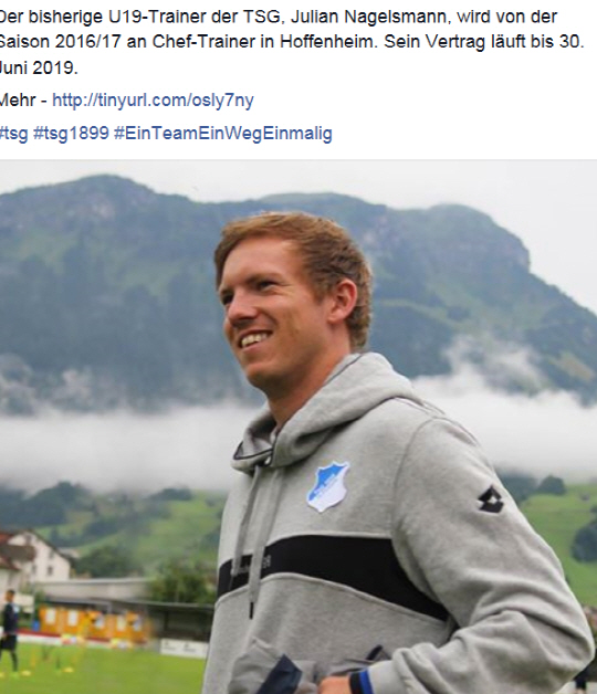 니겔스만 감독은 현재 호펜하임 유스팀 감독을 맡으며 지도자 수업을 받고 있다. 지난해 독일 19세 이하(U-19) 챔피언십에서 우승을 차지하면서 가능성을 인장받았다. 2012~2013시즌에는 호펜하임 1군 코치를 맡기도 했다. 나겔스만 감독은 "감독 역할이 기대된다. 저에게 기회와 믿음을 주신 데 대해 감사하다"고 말했다.