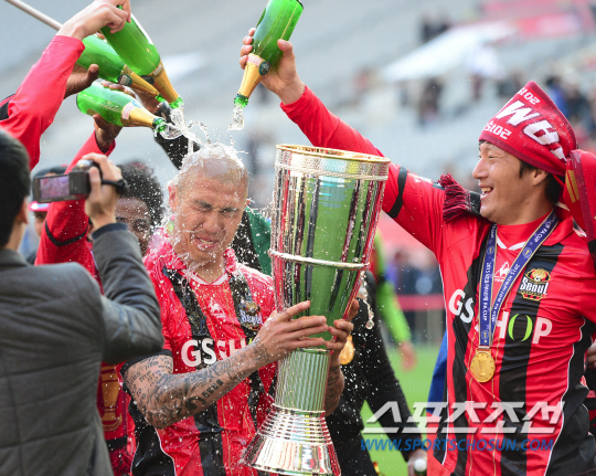 FC 서울과 인천 유나이티드의 2015 FA컵 결승전이 31일 서울월드컵경기장에서 열렸다. 서울이 3-1의 승리를 거두며 우승을 차지한 가운데 선수들이 우승컵을 든 차두리에게 샴페인 세례를 하고 있다. 서울월드컵경기장=정재근 기자 cjg@sportschosun.com/2015.10.31/ |