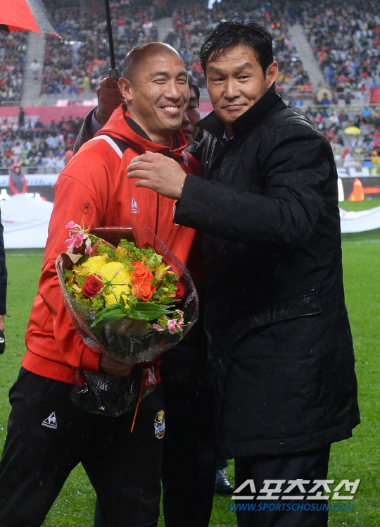 프로축구 K리그 클래식 FC서울과 수원삼성의 시즌 마지막 슈퍼매치가 7일 상암동 서울월드컵 경기장에서 열렸다. 차두리가 하프타임에 열린 자신의 은퇴식에서 최용수 감독으로 부터 꽃다발을 받고 있다. 상암=최문영 기자deer@sportschosun.com /2015.11.07/