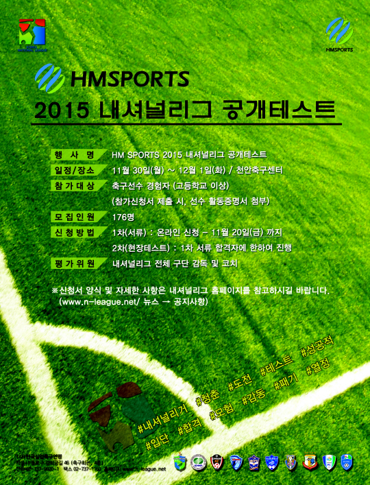 한국 내셔널리그(회장 권오갑)는 30일과 12월1일 양일간에 걸쳐 천안축구센터에서 'HM SPORTS 2015 내셔널리그 공개테스트'(이하 공개테스트)를 개최한다.