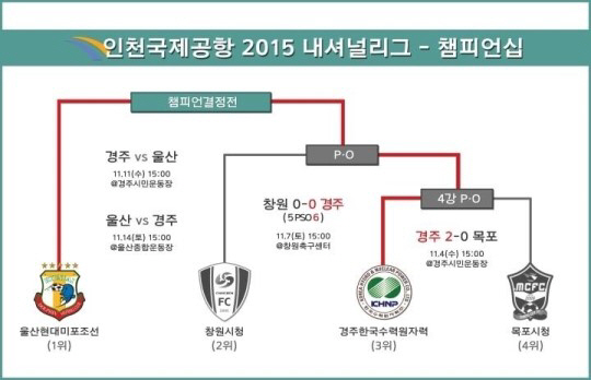 울산현대미포조선과 경주한수원은 11일 경주시민운동장에서 2015년 인천국제공항 내셔널리그 챔피언결정전 1차전을 펼친다. 2년만의 리턴매치다.두 팀은 2013년 챔피언결정전에서 만났다. 당시 울산현대미포조선이 1승1무로 우승을 차지했다. 이번 챔피언결정전은 홈&어웨이 방식으로 1, 2차전을 치른다. 승점, 골득실, 원정다득점 순으로 승자를 결정한다. 그래도 동률일때는 2차전에서 연장전을 실시하고, 연장에서도 승부가 나지 않을 경우 승부차기를 진행한다.