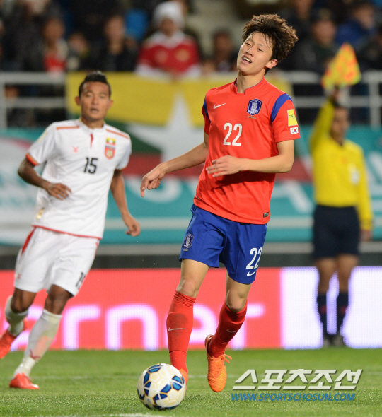 슈틸리케 감독이 이끄는 축구대표팀이 12일 수원월드컵경기장에서 미얀마와 2018 러시아월드컵 아시아지역 2차예선 경기를 가졌다. 이재성이 오프사이드를 범한 후 아쉬워하고 있다. 수원=허상욱 기자 wook@sportschosun.com/2015.11.12/