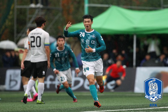 용인대 강지훈이 성균관대와의 왕중왕전 결승전에서 선제 결승골을 터뜨린 뒤 포효하고 있다. 사진제공=대한축구협회