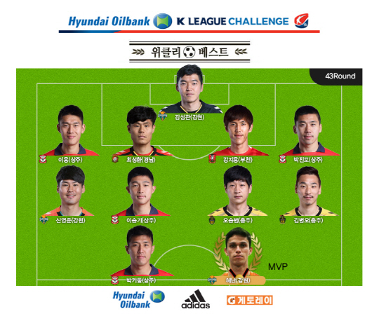 한국프로축구연맹은 17일 발표한 43라운드 위클리베스트에서 헤난을 주간최우수선수(MVP)로 선정했다. 프로연맹은 헤난을 두고 '원샷원킬의 진수를 보여준 스트라이커로 기회를 놓치지 않는 결정력으로 2득점 작렬'이라는 평가로 MVP선정 배경을 밝혔다. 헤난은 팀 동료 신영준 강성관(이상 강원) 및 김병오 오승범(이상 충주) 이승기 박진포 이 용 박기동(이상 상주) 최성환(경남) 강지용(부천)과 함께 주간 베스트11에도 선정되는 겹경사를 누렸다. 강원의 2대1 역전승으로 마무리 된 승부는 위클리 매치, 주간 최우수팀에는 상주가 뽑혔다.