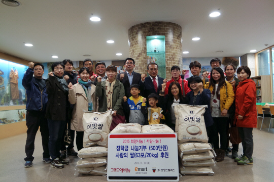 지역기업과 함께 한 포항은 17일 오후 지역의 소외계층인 다문화가정을 위해 그랜드애비뉴 장학금 500만원과 이마트에서 지원하고 매칭그랜트 방식으로 적립한 20kg 쌀 63포를 지역의 다문화가정을 위해 포항시에 전달했다.