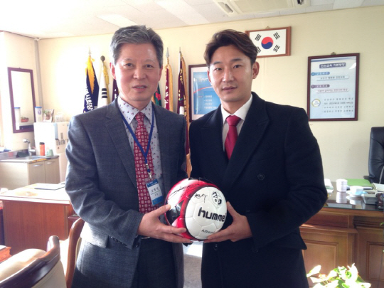 모교를 찾은 이천수는 먼저 고영석 부평동중 교장 선생님을 찾아 인사드리고 친필 사인볼을 기념으로 선물했다.