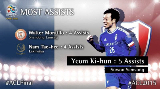 아시아축구연맹(AFC)은 19일(한국시각) 공식 트위터를 통해 각 부분 선수 기록을 발표했다. 염기훈은 5도움으로 왈테르 몬티요(산둥)와 남태희(레퀴야·이상 4도움)를 제치고 도움 부문 1위를 차지했다. ACL 결승전이 알 아흘리(아랍에미리트)-광저우 헝다(중국) 간의 맞대결로 결정된 만큼, 염기훈의 도움부문 1위는 유력해 보인다.