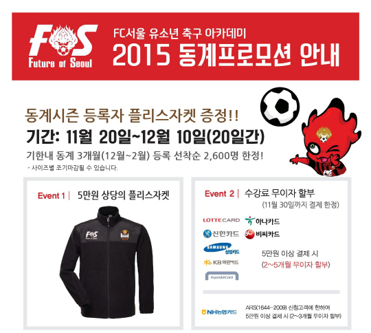FOS는 겨울학기인 12월부터 2월까지 3개월 이상 등록하는 유소년 회원들에게 FC서울 플리스 자켓(Fleece Jacket)을 선물한다. 이번 특별 이벤트는 20일부터 오는 12월 10일까지 20일간 진행되며, 선착순 2600명에 한해 지급된다. FC서울 플리스 자켓(Fleece Jacket)은 겨울철 체온 유지에 효과가 뛰어나며, 신축성이 좋아 축구 등 활동량이 많은 운동을 포함해 겨울철 야외활동에 유익한 제품이다. FOS 이벤트 담당자는 "겨울철 어린이들의 운동 부족을 보완하고자 이번 이벤트를 기획했다. 기존 회원은 물론, 신규 회원 모두 받을 수 있는 혜택인 만큼 많은 어린이들이 Future of FC서울과 건강하게 겨울을 보내 수 있길 바란다"고 말했다.