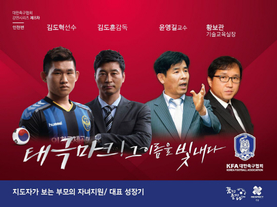 올해 인천 유나이티드 감독으로 부임해 팀을 FA컵 준우승으로 이끈 김도훈 감독은 '지도자가 보는 부모의 자녀 지원 및 대표성장기'라는 주제로 박문성 축구 해설위원과 함께 토크쇼 형식의 강연을 진행한다. 1998 프랑스 월드컵을 포함 A매치 72경기에 출전하며 리그 최강의 스트라이커로 공인받았던 김 감독은 선수 시절은 물론 청소년대표팀 코치, 프로팀 감독의 경험을 살려 후배 및 학부모들에게 생생한 조언을 들려줄 예정이다. 이 자리에는 인천 유나이티드의 미드필더인 연세대 출신 김도혁도 함께 한다. 황보관 대한축구협회 기술교육실장과 캐나다여자월드컵에서 여자대표팀 멘탈 코치를 담당했던 윤영길 한체대 교수도 강사로 나선다.