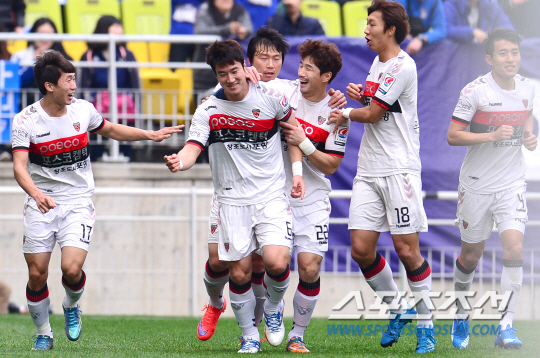 파상공세를 펼친 포항은 전반 7분 만에 선제골을 터뜨렸다. 왼쪽 측면에서 맞은 세트피스 상황에서 신진호의 프리킥을 김준수가 문전으로 쇄도하면서 헤딩슛으로 골망을 흔들었다.