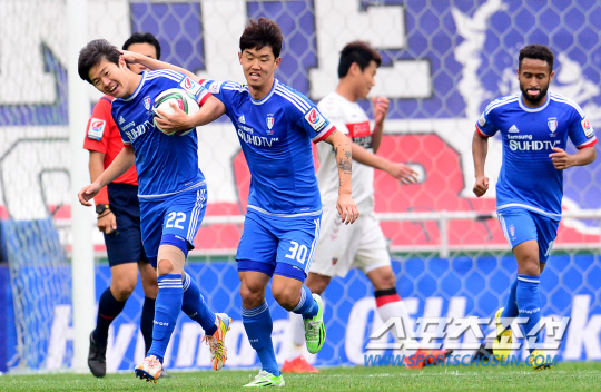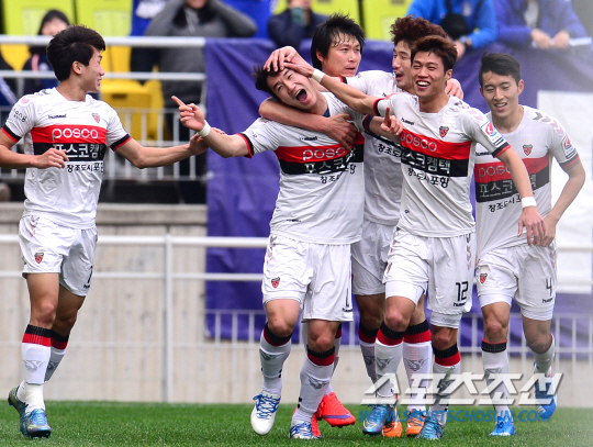 22일 오후 2시 수원월드컵경기장에서 2015 현대오일뱅크 K리그 클래식 37라운드 수원과 포항의 경기가 열렸다. 수원은 승점 61점으로 4위를 기록 중이고 포항은 승점 63점으로 2위를 달리고 있다. 포항 김준수(왼쪽 두 번째)가 전반 8분 만에 선취골을 기록했다. 동료들과 함께 환호하고 있는 김준수. 수원=송정헌 기자 songs@sportschosun.com/2015.11.22