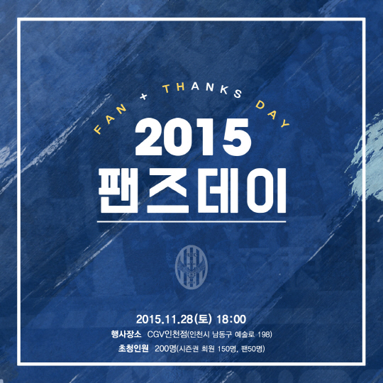 올 시즌 FA컵 준우승, 리그 7위라는 호성적을 기록한 인천은 올 한 해 동안 구단을 지지해준 팬들을 대상으로 28일 홈경기 종료 직후 CGV인천점(인천시 남동구 예술로 198)에서 'Fan Thanks day'라는 주제로 2015시즌 팬즈데이를 연다.