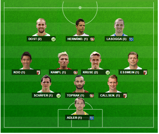 빌트지는 전방에 바스 도스트(볼프스)-하비에르 에르난데스(치차리토·레버쿠젠)-피에르 미셀 라소가(함부르크)를, 중원에 구자철-케빈 캄플(레버쿠젠)-막스 크루제(볼프스)-에스바인을, 수비진에 마르셀 샤퍼(볼프스)-외메르 토프락(레버쿠젠)-칼센 브라커를 선정했다. 수문장은 레네 아들러(함부르크)가 차지했다.