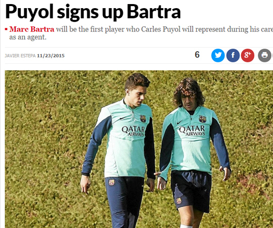 문도 데포르티보 등 스페인 매체들은 24일(한국 시각) "푸욜이 에이전트로 나선다. 첫 고객은 마르크 바르트라(24·바르셀로나)"라고 보도했다.