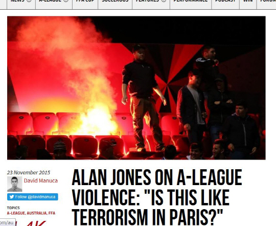 이런 가운데 호주 라디오 방송 4BC의 유명 진행자 앨런 존스가 과도한 발언으로 불난데 기름을 끼얹었다. 존스는 자신이 진행하는 아침 쇼에서 윌슨과의 인터뷰를 통해 'A-League shame file'을 얘기하던 중 경기장 소란 행위를 파리 테러에 비유했다. 존스와 윌슨은 훌리건의 과격 행동은 문화의 문제이며 외부로 자꾸 확산되는 만큼 내부에서 해결해야 하고, FFA의 강력한 대책을 촉구하는 등 '축구판 개혁'을 제안하려는 취지였다. 하지만 파리 테러를 결부시킨 발언이 부각되는 등 논란만 눈덩이처럼 커지고 있다.