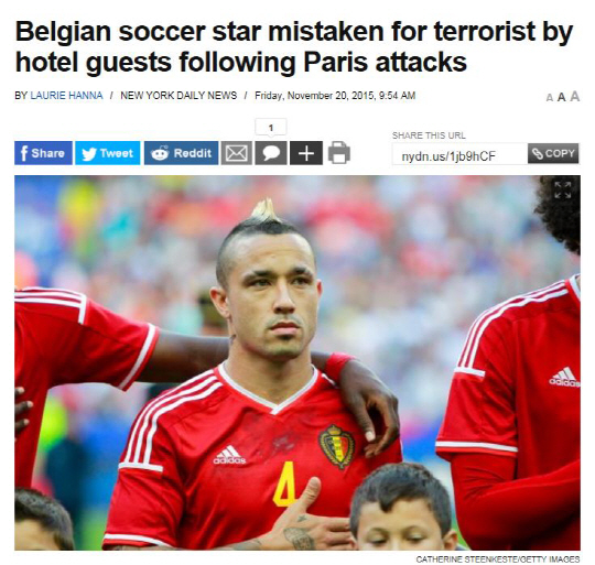 그런가 하면 벨기에에서는 벨기에 축구대표팀의 유명 미드필더 라자 나잉골란(27·AS로마)이 테러 용의자로 오인받는 소동이 있었다. 나잉골란은 18일 예정됐던 스페인전에 차출됐다가 경기가 취소된 뒤 벨기에 앤트워프의 래디슨호텔에서 휴식을 취하다가 긴급 출동한 경찰과 맞닥뜨렸다. 다른 투숙객이 나잉골란의 외모와 행동이 수상하다고 느껴 경찰에 신고했던 것. 당시 파리 테러 용의자가 벨기에로 숨어 들어간 것으로 알려진 터라 경찰은 비상을 걸 수밖에 없었다. 다행히 출동한 경찰이 나잉골란을 한눈에 알아보면서 해프닝으로 일단락됐고, 나잉골란은 경찰들과 기념촬영까지 했다.