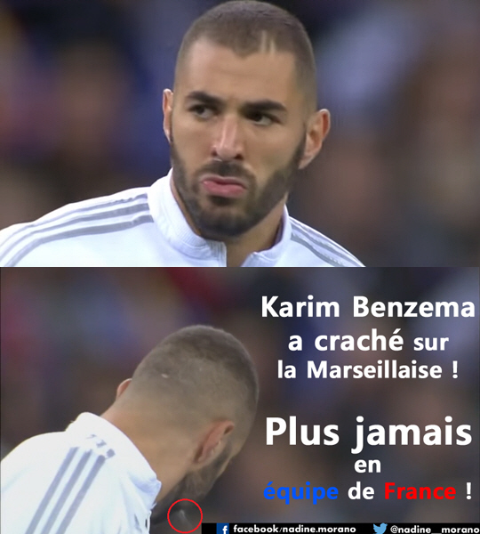 이때 벤제마가 국가 연주 말미에 고개를 돌리며 침을 뱉는 장면이 TV카메라에 포착된 것. 모라노 전 장관은 "벤제마의 행동은 희생자들과 그 유족, 더 나아가 프랑스라는 나라 전체에 대한 모욕"이라며 "대표팀 선수는 그 명예에 걸맞는 행동을 취해야한다. 벤제마는 프랑스 대표팀에서 영구 퇴출되어야한다"라고 강도높게 비판했다.