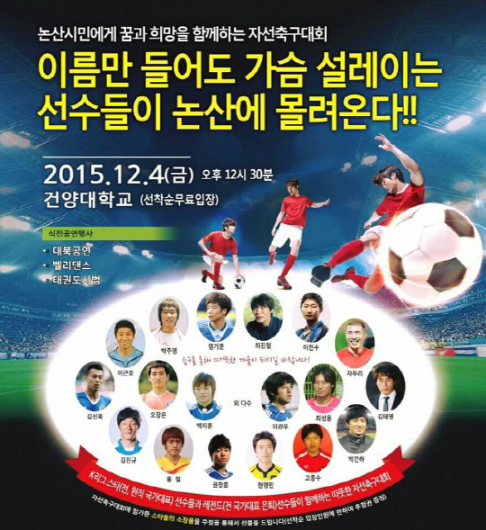 K리그 전-현직 선수들의 봉사모임인 '추캥(축구로 만드는 행복)'은 4일 오후 12시30분 충남 논산의 건양대 운동장에서 자선경기를 펼친다. 올해로 16회를 맞는 이번 자선경기는 국가를 위해 희생하시 분들을 돕고 축구 선-후배 간 우의를 다지는 의미에서 치러진다. '축구팀'에는 박건하 A대표팀 코치가 지휘봉을 잡는 가운데 오장은 염기훈(이상 수원) 박주영(FC서울) 김영광 조원희(이상 서울 이랜드)가, '행복팀'은 최진철 포항 감독을 비롯해 권창훈(수원) 이재성(전북) 김신욱(울산) 김호남(광주) 등이 자리를 잡았다.