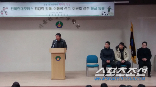전북 현대의 최강희 감독이 이동국 이근호와 4일 서울 신정동에 위치한 은정초등학교를 방문했다.