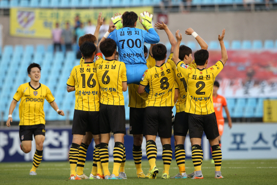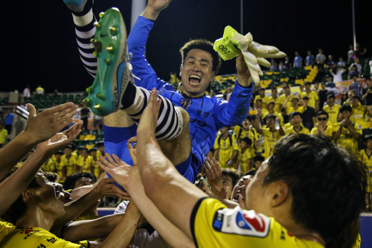 광양축구전용경기장/ K리그 클래식/ 전남드래곤즈 vs 제주유나이티드/ 경기종료/ 전남승리/ 전남 김병지 헹가래?/ 사진 김지훈