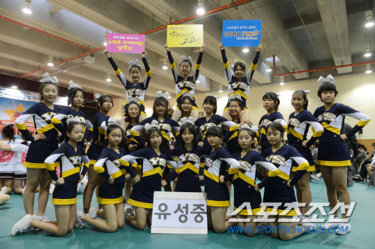 '여학생 체육 활성화' KBS 2TV 월화드라마 '발칙하게 고고'의 촬영이 6일 세종특별자치시 도담동주민센터의 체육관에서 진행됐다. 촬영현장에 함께한 대전 유성중학교 스턴트 치어리딩팀이 포즈를 취하고 있다. 세종=허상욱 기자 wook@sportschosun.com/2015.11.06/ |
